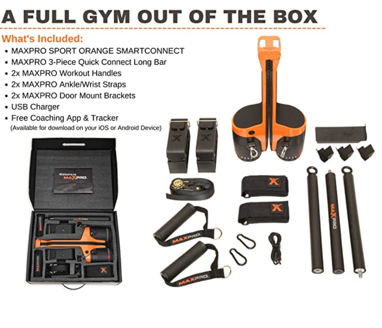 - El paquete incluye: Barra larga de conexión rápida de 3 piezas, 2 asas de entrenamiento 2 correas de tobillo y muñeca , 2 soportes de montaje para puerta y cargador USB.